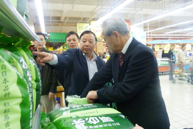在欧尚超市,姚准明主任和日本客商对南京欧尚超市集中苏垦大米主打品种,配合质量追溯系统出地堆,以“促销+宣传”的综合营销手段表示了充分的肯定。并饶有兴趣的体验了苏垦米业质量追溯系统的操作,还登录到公司质量追溯信息管理平台,详细了解了苏垦大米从田间种植到超市销售这一整条质量追溯链中各环节的信息,他们对苏垦大米质量追溯系统表现出了浓厚的兴趣。日本客商在欧尚超市还参观了解了苏垦米业两大合作伙伴:旺旺和亨氏的旺旺食品系列和亨氏营养米粉系列产品。 在南京苏果超市清凉门店,公司领导向日本客商展示了南京地区销售的所有苏垦大米产品,日本客商对公司新推出的以日本稻谷品种加工而成的“水谷原”和“冬天的雪”两款产品表现出了浓厚的兴趣。 图为项永祥总经理向日本客商介绍公司产品“水谷原”