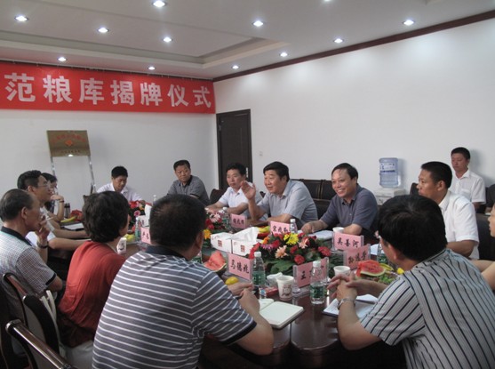 在二楼会议室,吴善河向各位领导汇报了储备库成立以来的发展过程,江苏省黄海粮食储备库有限公司是由江苏农垦与省粮食局共同出资于2009年5月组建成立的,库容近6万吨,其中省级储备粮4万吨。2010年底,按照江苏省粮食局要求,通过开展创建省示范粮库活动,促进仓储规范化管理水平不断提高。三年来,在省粮食局、农垦集团公司、米业公司、黄海农场的正确领导和大力支持下,储备库三年走出三大步,保粮设备越来越先进,管理措施越来越完善,效益一年比一年好,起到了示范和推动作用。 严长俊用“愉快、友好、高效”高度赞扬黄海储备库成立三年来为确保全省粮食安全、调控平衡粮食市场做出的积极贡献。他希望黄海粮食储备库一如既往地科学把握市场经济规律、遵循粮食流通规律,成为国内一流的粮食仓储基地和加工基地,争创国家级示范粮库。 胡兆辉感谢省粮食局多年来对农垦粮食工作的关心支持。他表示此次揭牌,为黄海粮食储备库搭起了腾飞的平台。希望双方继续发挥各自比较优势,立足高起点、高标准,将黄海粮食储备库打造成全国粮食行业的一面旗帜,构建互利共赢的典范。